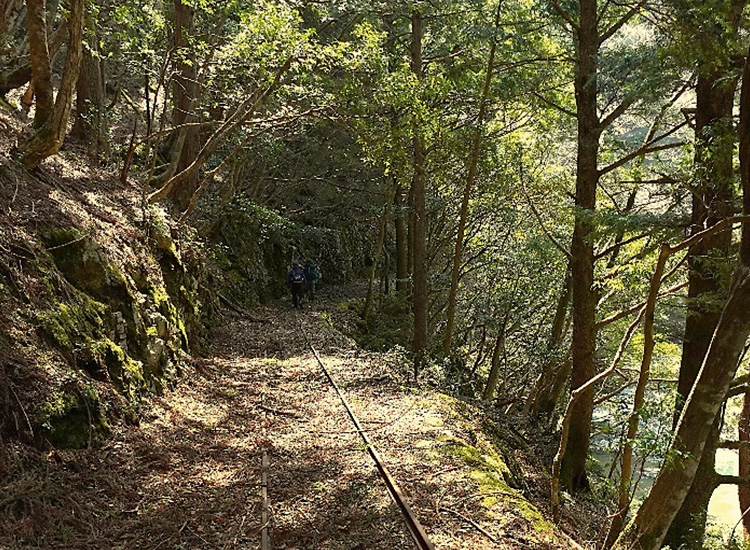 トロッコ道はV字峡谷を流れる美山川(由良川)本流に沿って続いています。川と崖の間の狭い平地と切り立った崖を削ってわずかな場所をつないで作られたものです。