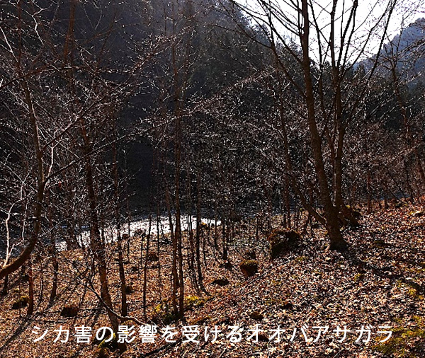 下草がなく、高い木がバラバラと生えているからです。下草が生えていないのは鹿が全て食べてしまうからです。下草がなくなり裸地となると土の保水力が低下し、また窒素などの植物に必要な養分も減ってしまうのです。