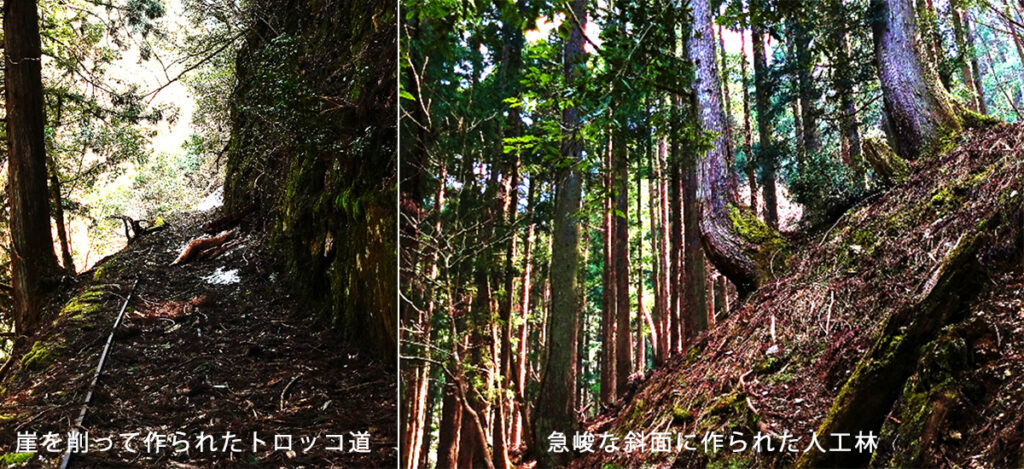 ビジネス上条件の悪い場所に植えられた杉の林は、歴史の中で存在価値を失ったままの状態となっています。 トロッコ道と杉の人工林は日本の戦後復興と近代化のもう一つの側面に気づかせてくれます。